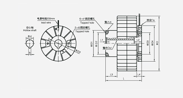 外殼旋轉空心軸磁粉離合器使用安全DC24V直流電壓,法蘭盤輸入、空心軸輸出,空心軸支撐,外殼旋轉。扭矩規格有6Nm、15Nm、25Nm、50Nm、100Nm、200Nm、400Nm等7個標準規格。臺靈機電支持非標準規格定制生產。外殼旋轉空心軸磁粉離合器結構簡單緊湊、低發熱低噪音、降低設備制造、維護成本低、安裝操作方便、耐磨耗、使用壽命長以及安裝方便不占空間等等。適合匹配張力控制器使用,并通過張力控制器調節激磁電流的大小來控制其扭矩的大小,方便、穩定。